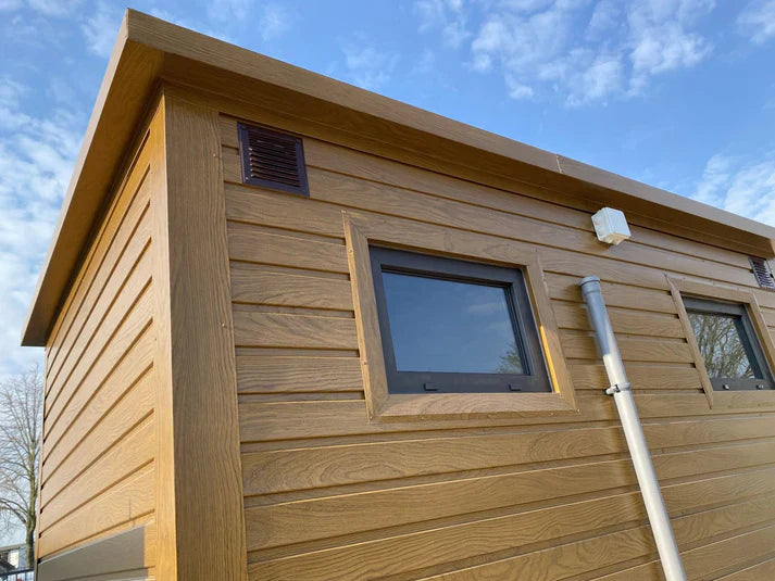 Gracias a su acabado exterior en diseño madera, este modelo se integra perfectamente en entornos naturales, ofreciendo una imagen cuidada sin renunciar a la robustez y durabilidad propias de un contenedor sanitario profesional. Se entrega listo para su uso inmediato: basta con conectar la electricidad, el agua y las aguas residuales.